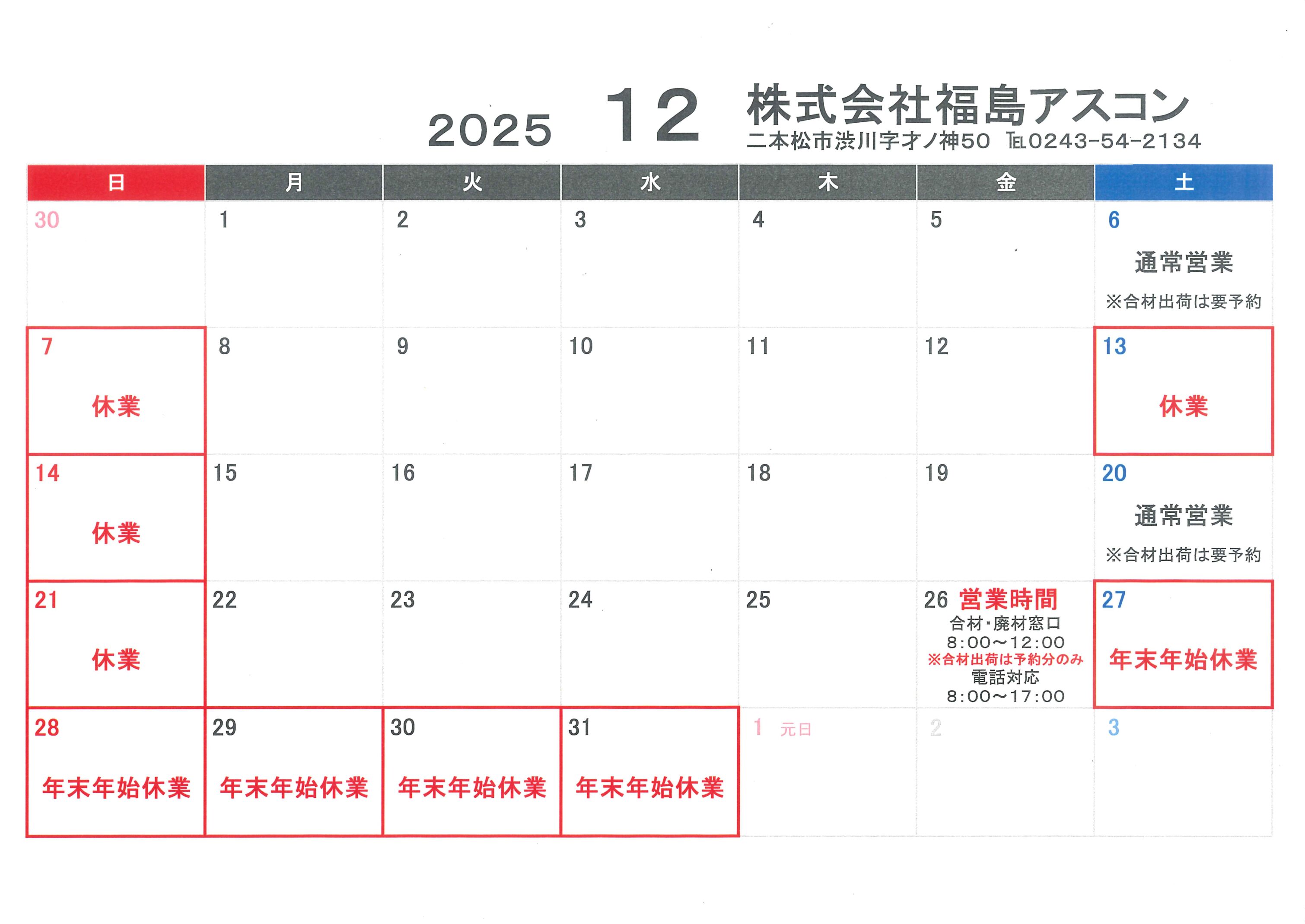 2025.11.27 2025年12月の営業日のお知らせ 2025年12月の営業日をお知らせいたします。 毎週日曜日、祝日、第2・第4土曜日は休業日となります。 一覧へ戻る CONTACT お問い合わせ ご質問・お見積りのご依頼など、お気軽にご連絡ください。 0243-54-2134 メールフォーム